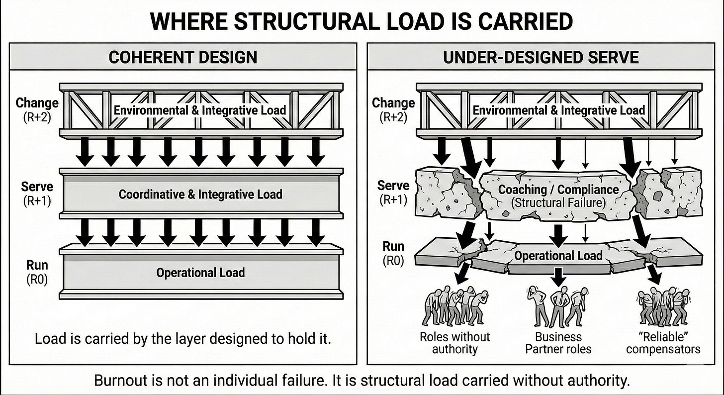 This is why Serve gets so easily misunderstood. When Serve is under-designed, integrative and coordinative load is displaced into roles not designed to carry it. The system remains intact by consuming human capacity instead of resolving structure.